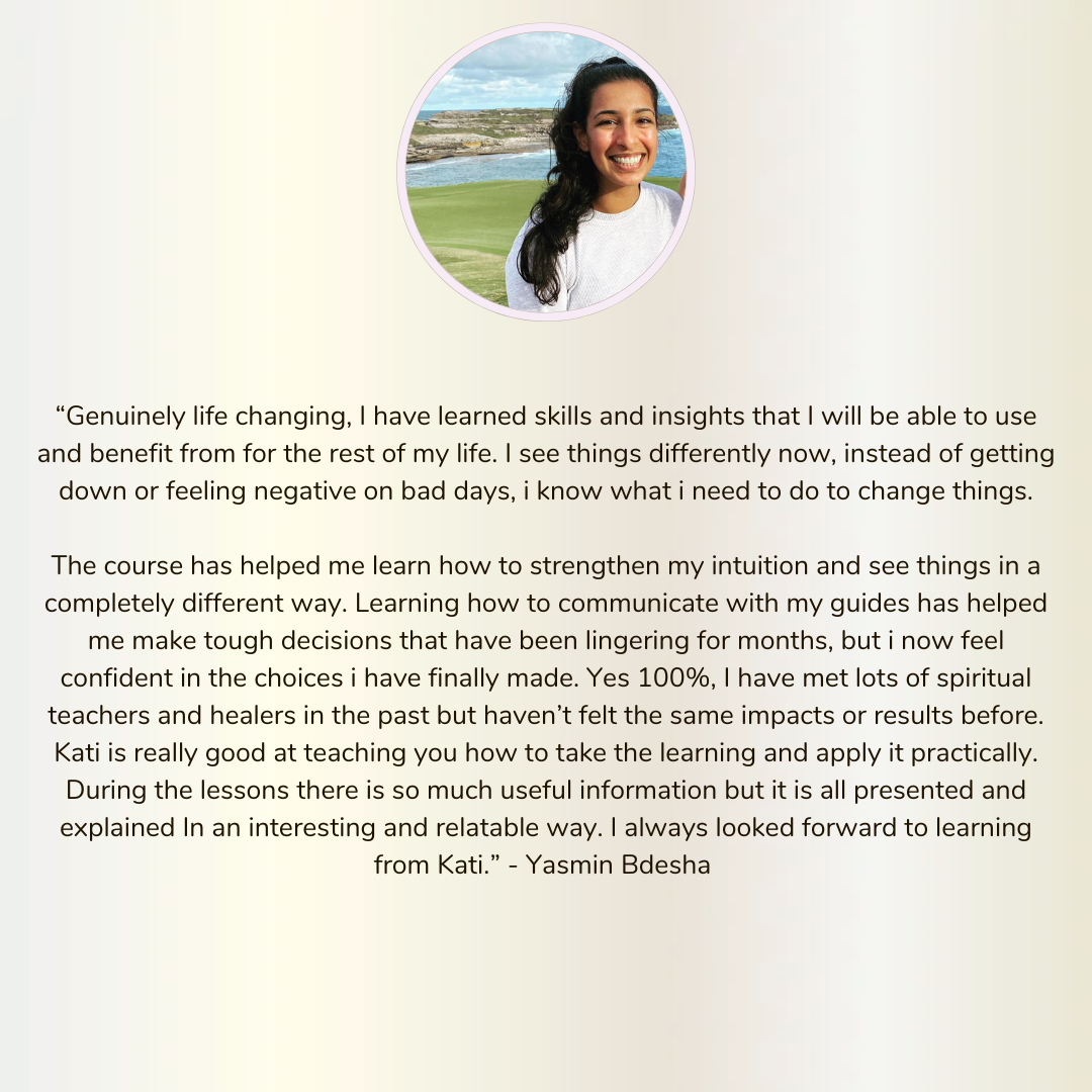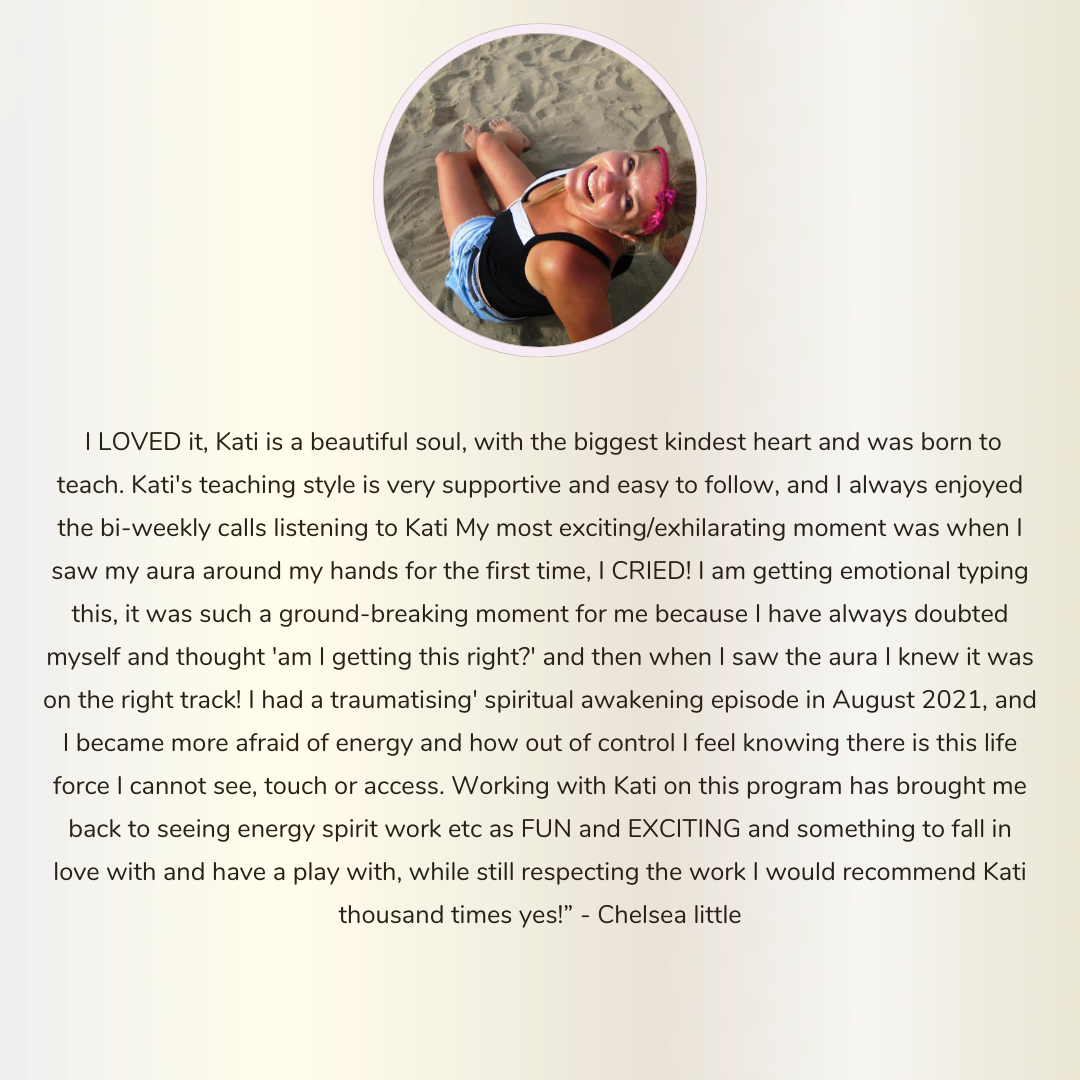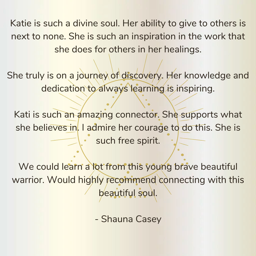 “I went to Kati for her summer special, including the Reiki, Crystal Healing etc. and I could not recommend her enough. I have always been interested in spirituality and have suffered quite a trauma in my childhood and wanted to be able to heal. Kati was so warm, welcoming and professional. She made me comfortable as soon as I walked in the door. I will 100% be using her services again.”